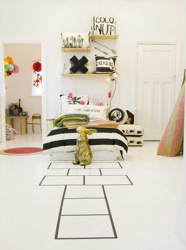 This room is totally funky to us! Decorated by Elsie’s Larson, who is quite a funky character herself and owner of A Beautiful Mess website, has incorporated elements like a guitar, a neon cactus lamp, a lightup sign with a fun message, wood rainbow and cactus plush softie in this kids-friendly guestroom. We would actually imagine it belonging to just one funky girl who invites her friends to play guitar in it.